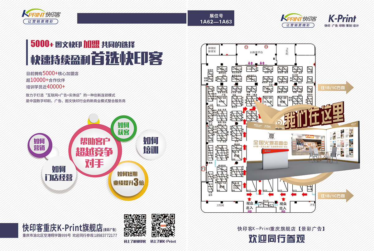 快印客旗下广告快印连锁品牌——K-Print互联网+技术营销体验店(简称KP店)将参加此次盛会。欢迎各位精英同行前往快印客展位(1A-62、1A-63)参观交流,相信KP店新颖的广告模式,一定能成为众多参展商中最熠熠生辉的一位,带给您高大上的营销体验,让您不虚此行!