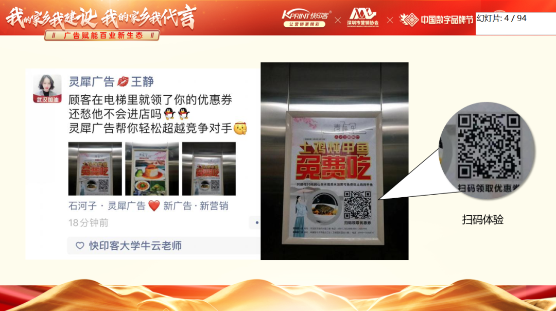 灵犀广告王总运用场景前置的思路,为餐饮客户打造智慧型电梯海报,让消费者在电梯内扫码即可查看、感受到餐厅的氛围,从而引导他们产生消费行为,这一举动让餐饮客户的业务得到了更好的推广……