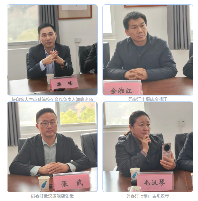 参与座谈会的还有快印客大生态系统校企合作负责人潘峰老师、码客汀武汉旗舰店张武、码客汀人在做传媒付国洲、码客汀十堰店余湘江、码客汀七剑广告毛汉琴、码客汀汇天广告陈华楠、保时客未来广告彭卫等。