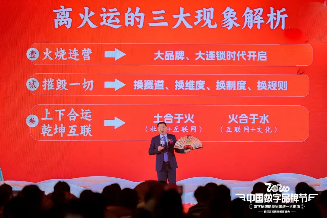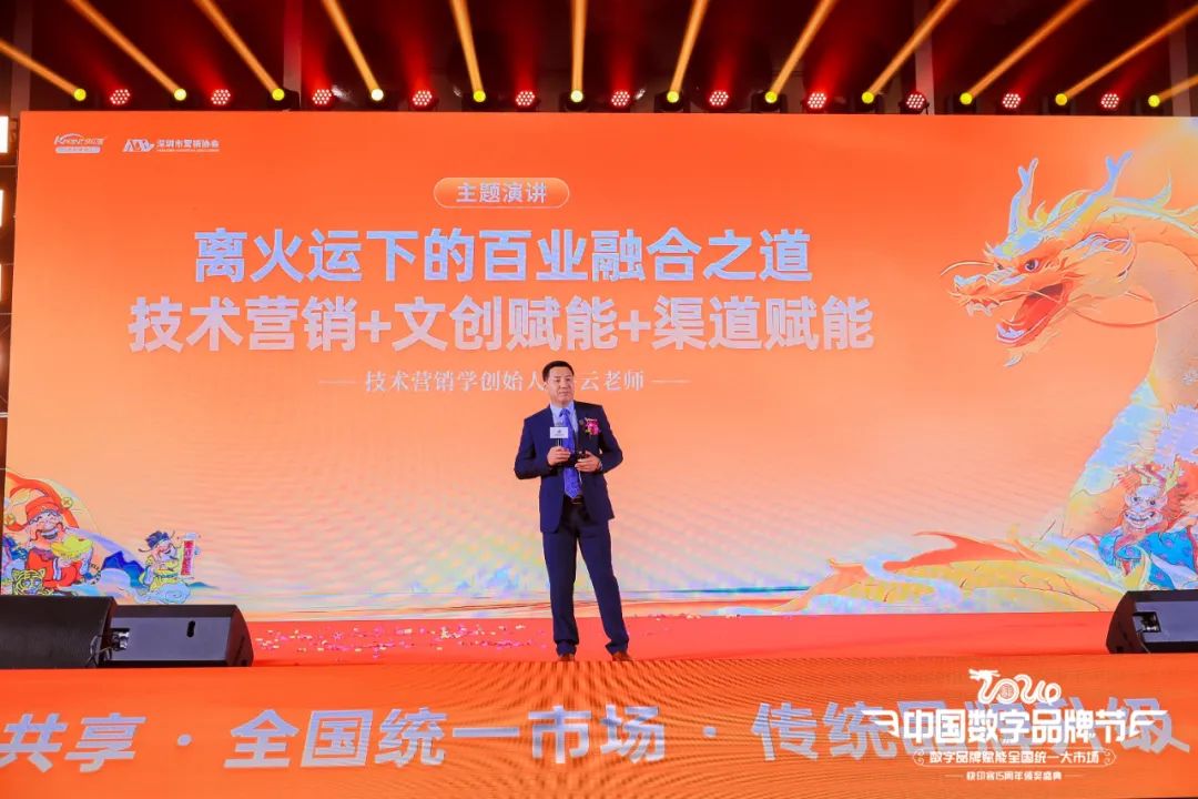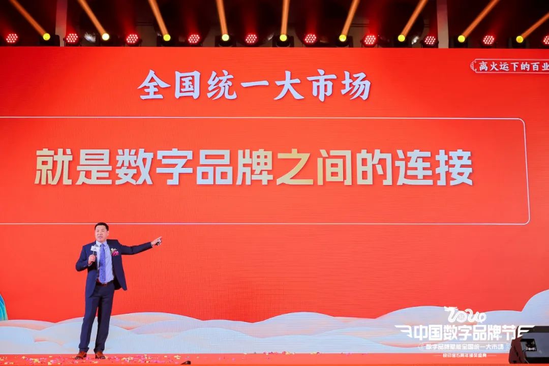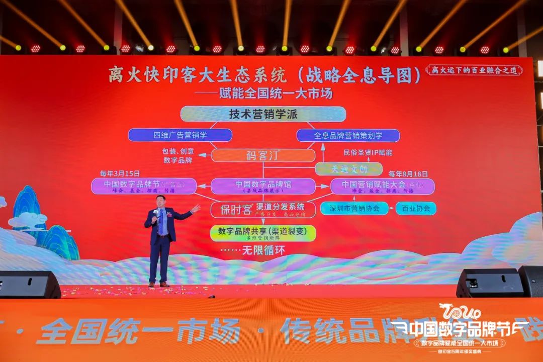 中国数字品牌节发起人/总策划、快印客大生态系统掌门人、技术营销学创始人牛云老师为峰会拉开思维碰撞的序幕,就《离火运下的百业融合之道》主题做精彩分享。他深入剖析数字品牌如何赋能“全国统一大市场”的奥秘,讲解在变革的时代背景下如何抢占商业先机。通过数字品牌的连接、共享与赋能,如何帮助每个县域品牌实现数字化转型,从而构建一个全国范围内的统一大市场。
