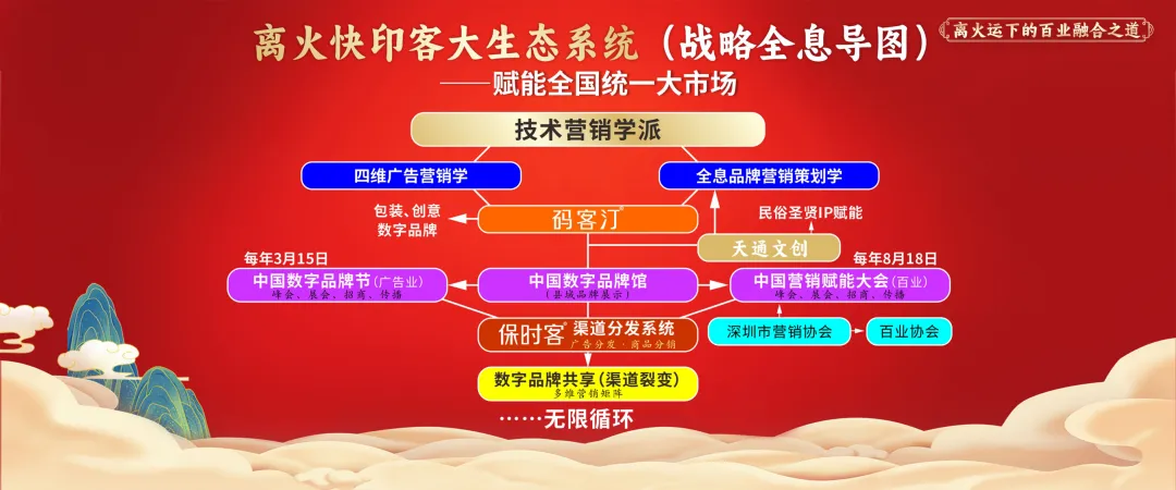 大会现场,牛云老师首次发布离火快印客大生态系统——战略全息导图。在数字经济时代下,我们用技术营销学派这盏明灯,以四维广告营销学、全息品牌营销策划学为理论依据,通过互联网技术实现广告的赋能升级,助力中小企业数字化转型升级。