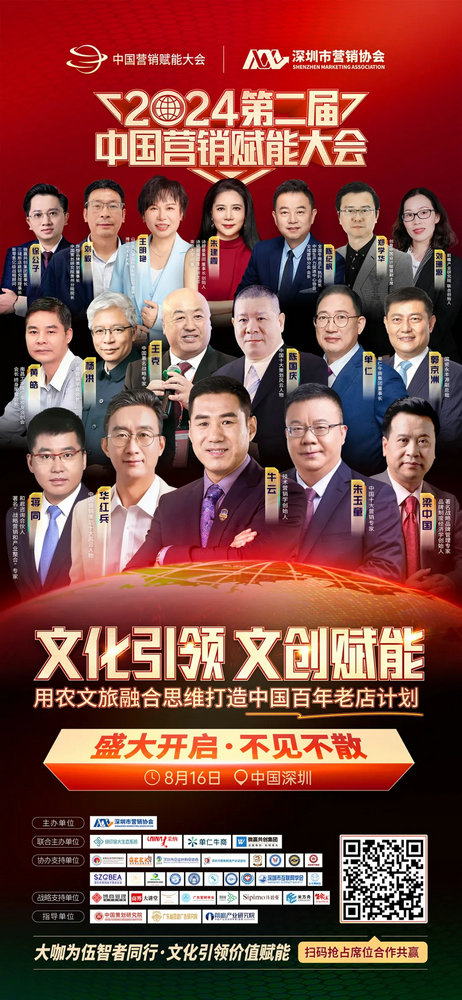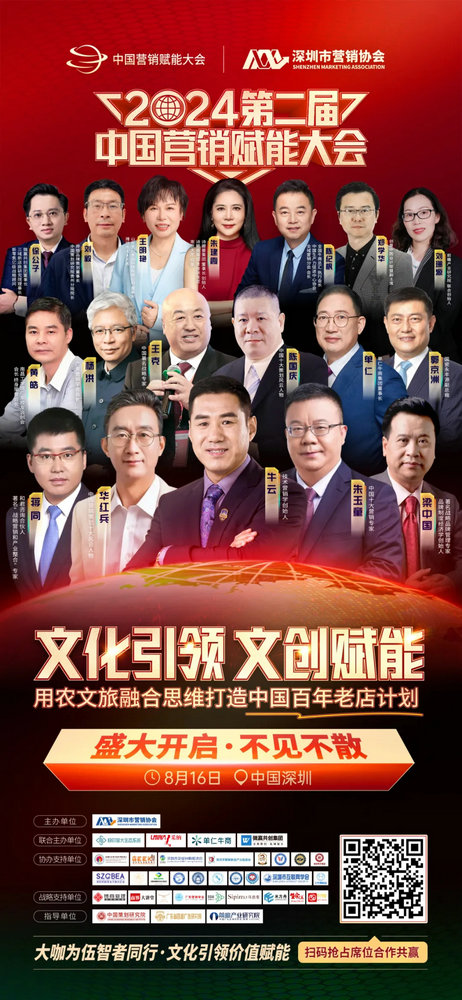 以“文化引领 文创赋能,用农文旅融合思维打造中国百年老店计划”为主题的2024第二届中国营销赋能大会将于2024年8月16日在深圳龙岗珠江皇冠假日酒店隆重举行。