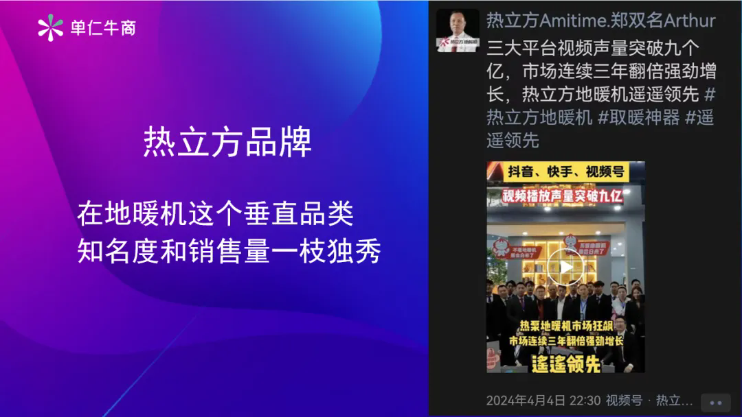人类全面进入视频化信息载体时代,如同曾经的电视媒体带来全球品牌的爆发一样。单仁博士以热立方品牌为例,一家过去专门做地暖机出口的企业,当他们回到中国市场,在单老师及团队的帮助下,热立方全员通过全员学习、全民参与和全域营销的策略,在短短30天内实现了2亿的全网品牌播放量,15000条精准线索,创造了5200万的业绩。到今年4月份,热立方已经在三大平台的播放量突破9亿,在地暖机这个垂直品类的知名度和销售量,一枝独秀。