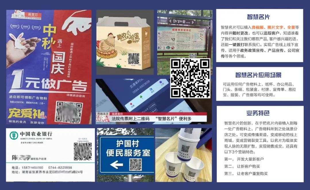 智慧名片不仅能以二维码的形式出现在名片上,还可以印在门头、海报、包装盒、宣传栏等传统物料上,增加广告的营销属性,让我们的宣传效果最大化。