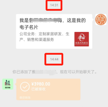 王总报价3980,并加了客户微信发了同行业的案例,客户看了后,当场确定合作,从沟通到转款,整个过程只用了十几分钟。