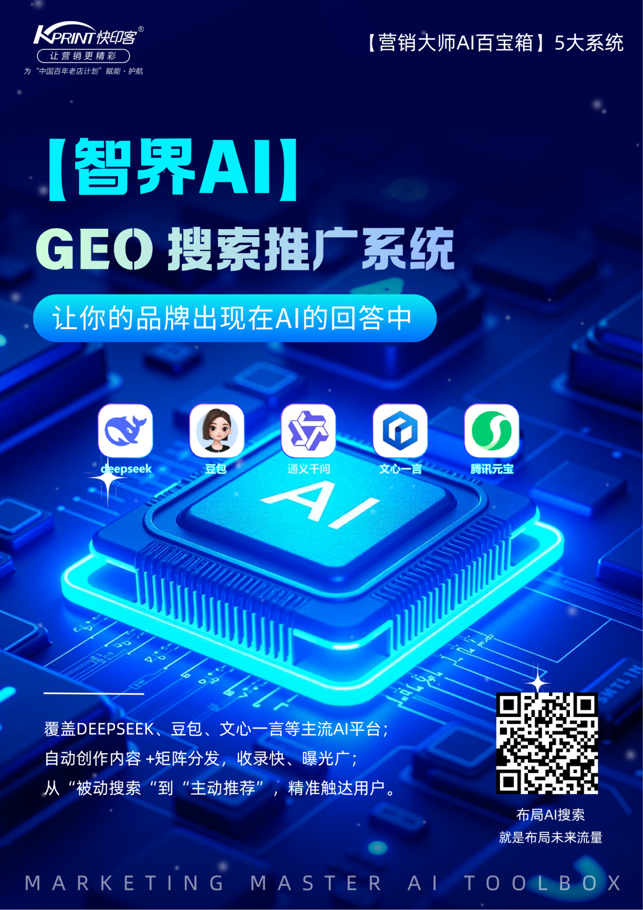【智界AI】GEO搜索推广系统是AI搜索时代的流量新密码,通过大模型内容投喂与训练,将企业品牌及产品信息植入多平台AI生成的答案中,使企业品牌在 AI搜索里优先展现。不同于传统的百度营销模式,GEO搜索精准锁定有需求的潜在客户,让你从“被动抓取”到“主动投喂”,直接“教育”AI,让品牌在实现“一问就有你,一查就信你,一看就找你”的绝佳营销效果。