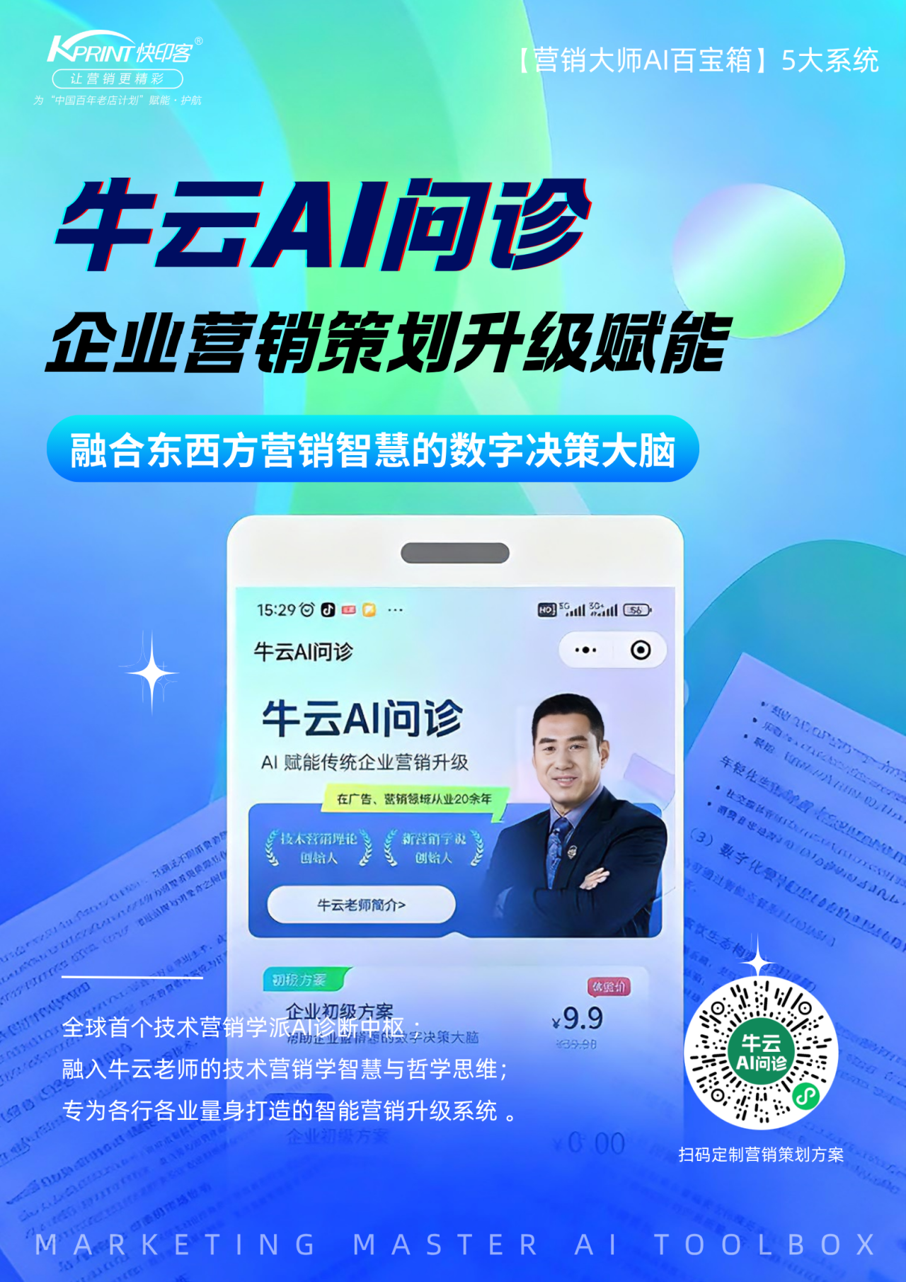 牛云AI问诊是全球首个技术营销学派AI诊断中枢,堪称企业的“营销军师”。它深度融入牛云老师的技术营销学智慧、哲学思维与文化赋能认知,通过自然语言交互解析企业痛点:从品牌定位模糊到获客成本高企,从素材创作乏力到转化路径不畅,系统能在 3 分钟内生成包含数据支撑、策略建议、案例参考的诊断报告。