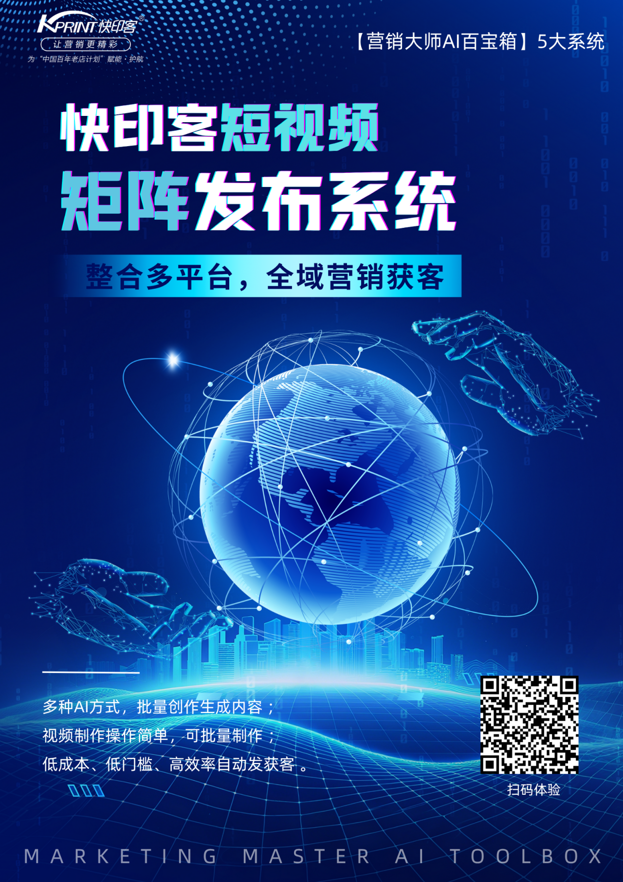 快印客短视频矩阵发布系统 支持多平台一键分发、智能混剪,快速引爆公域流量。主要功能是支持多平台多账号统一管理,可对抖音、视频号、小红书等主流短视频平台的账号进行统一管理。具备全平台一键发布功能,可将视频、图文内容一键同步分发至多个平台。同时还具有AI文案创作,可生成短视频脚本、标题等多种文案。视频制作简单,能通过脚本创作、智能混剪等,批量生成高质量短视频等功能。